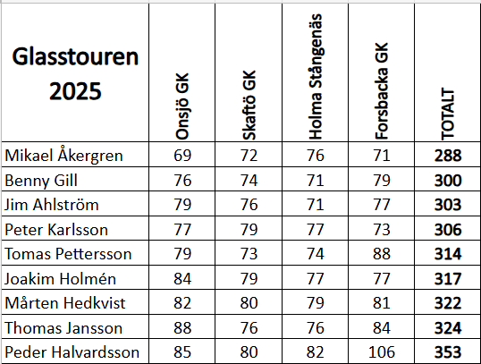Då summerar vi årets resa till västkusten och lyfter på hatten för Mikael Åkergren som vinner Glasstouren för första gången och han gör det med mycket bra spel under alla fyra dagarna. På de 71 hål vi spelade (Bara 17 på Onsjö) gjorde Åkergren, 2 birdie, 36 par, 30 bogey, 2 dubblar och bara 1 trippel bogey. Ett hål utan poäng och det var hål 13 på Holma Stångenäs där närspelet inte fungerade fullt ut, en imponerande resultatrad och stort grattis till segern!